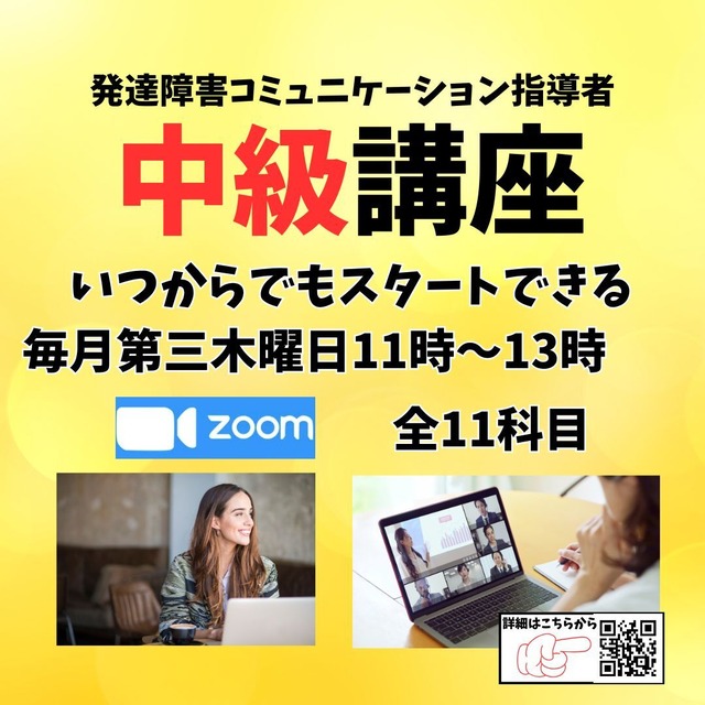 毎月第三木曜日朝 発達障害コミュニケーション指導者中級認定講座全11科目申し込みはこちらから